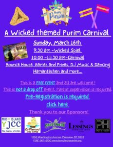 Sunday, March 16th 930 am -Wicked Spiel 1000 -1130 am-Carnival Gaga Pit, Games and Prizes DJ Music & Dancing Hamantashen – Mini Bagels – and more… This is a FREE EVENT and all are welcome ! Regi (17)