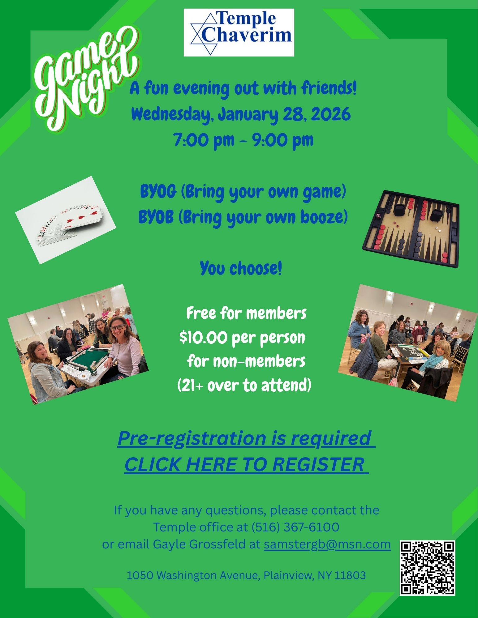 Join Temple Chaverim for our first Game Night A fun evening out with friends! Wednesday, May 28th 730 pm – 1000 pm BYOG (Bring your own game) BYOB (Bring your own booze) You choose!